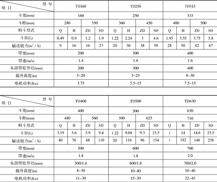 TD系列斗式提升機備有四種料斗:Q型(淺斗)、H型(弧底斗)、Zd型(中深斗)、Sd型(深斗)。